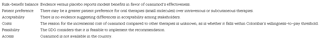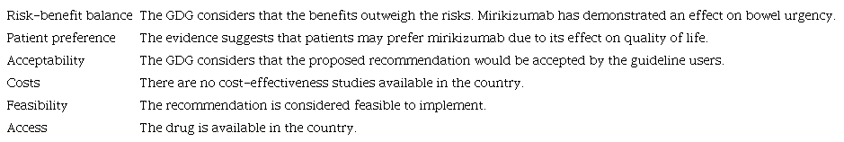 Resultados: Se actualizaron las recomendaciones y algoritmos para el tratamiento de inducción y mantenimiento de la colitis ulcerativa moderada a grave, y se proporcionan pautas sobre el uso de nuevos biológicos como vedolizumab, infliximab, upadacitinib, tofacitinib, ozanimod y mirikizumab, así como el cambio a vedolizumab e infliximab subcutáneo.