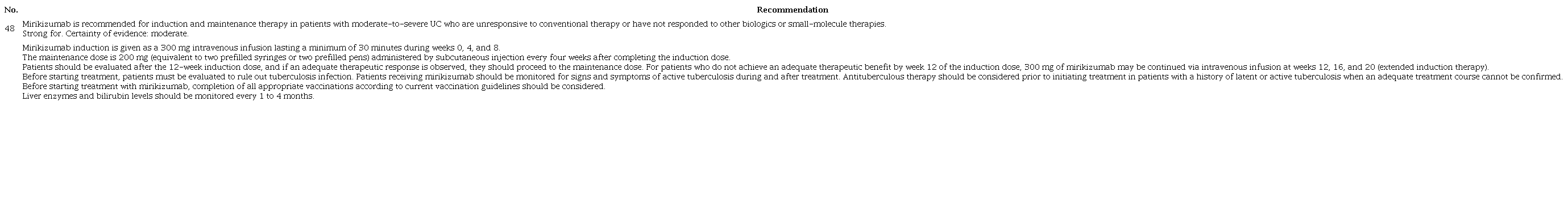 This evidence-informed clinical practice guideline was developed to provide recommendations for the treatment of moderate-to-severe UC with novel biologics and small molecules, as well as switching to subcutaneous infliximab and vedolizumab.