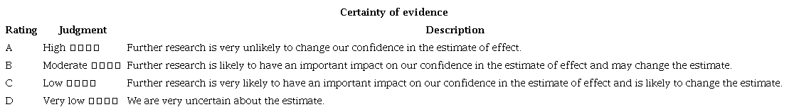 Schünemann H, Brożek J, Guyatt G, Oxman A. Manual GRADE para calificar la calidad de la evidencia y la fuerza de la recomendación. 1.a edición. PA Orrego MX Rojas; 2017.
