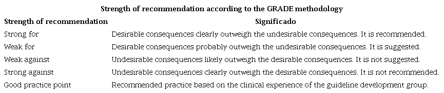 The guidelines follow the methodology proposed by the Grading of Recommendations Assessment, Development and Evaluation (GRADE) system and suggested by the manual for the development of clinical practice guidelines20, in which the levels of evidence and grades of recommendation presented in Table 2 are implemented.