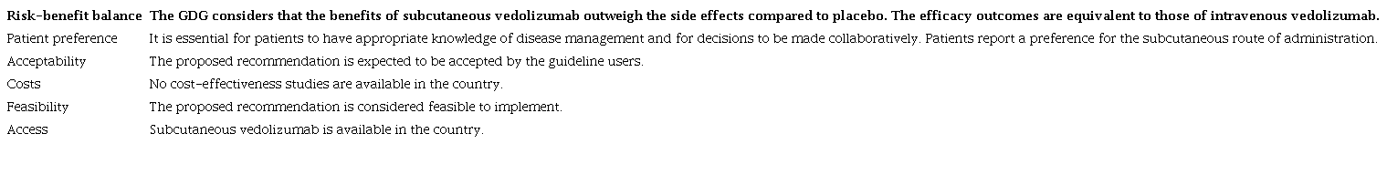 The Colombian Association of Gastroenterology and the Universidad Nacional de Colombia developed the Evidence-Based Guideline for the Management of Ulcerative Colitis in Adult Patients in 2015, followed by an update in 2020. By consensus, the development group decided that this guideline include questions addressing the efficacy and safety of new molecules, as well as the switch to subcutaneous vedolizumab and infliximab for the treatment of patients with moderate-to-severe UC.