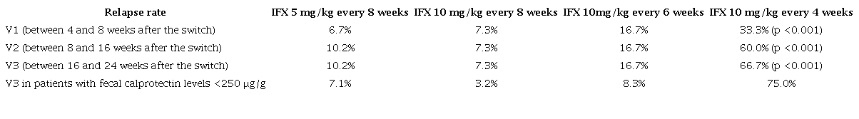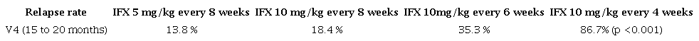 Table 6 shows relapse rates by infliximab dose and follow-up duration.