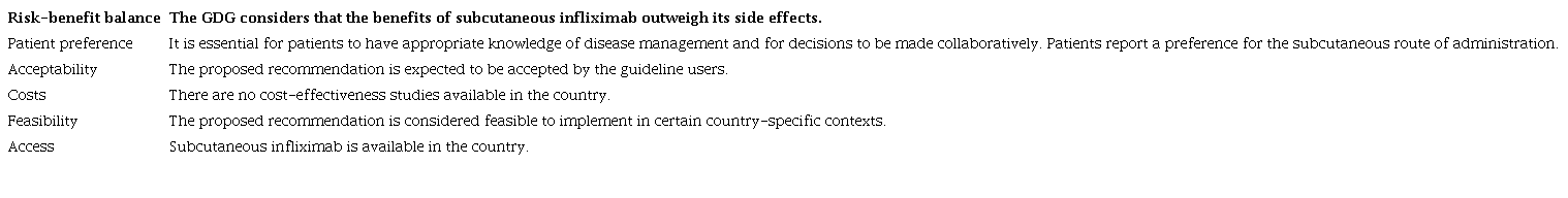 Evidence-to-recommendation tables were developed, which present the value judgments that led to the formulation of the recommendations. The Evidence to Decision (EtD) tables are available in the extended version of the guideline and present the decision regarding desirable effects, undesirable effects, certainty of the evidence, variability, risk-benefit balance, resources, cost-effectiveness, equity, acceptability, and feasibility. Additionally, the value judgments considered when formulating the recommendations are presented in each section.