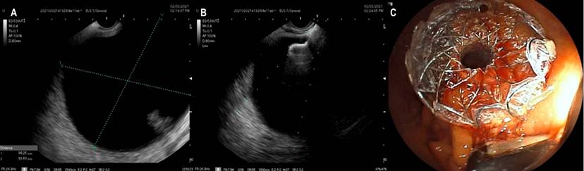 The patients underwent sedation assisted by anesthesiology using propofol; general anesthesia was not required. Ciprofloxacin 400 mg IV (single dose) was used as antibiotic prophylaxis. A Fujifilm EG-530UT2 linear echoendoscope with a SONART SU-1 ultrasound processor operated by an expert echo-endoscopist was used. Once the collection was evaluated by EUS (Figure 1A), a puncture was performed using a Doppler guide to check for the existence of interposed vessels.
