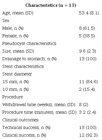 Resultados: la edad promedio fue 53,4 años, 8/13 fueron hombres. El tamaño medio del pseudoquiste fue de 9,56 ± 2,3 cm. El éxito técnico fue del 100% y el éxito clínico fue 92,3%. Los stents fueron retirados en promedio a las 8 ± 2 semanas. El tiempo medio del procedimiento desde la punción hasta el despliegue del stent fue 3,2 ± 2,4 minutos. En el control imagenológico hubo un adecuado drenaje de las colecciones en todos los casos. Hubo baja frecuencia de complicaciones, se documentó sangrado en 1 caso con requerimiento quirúrgico.