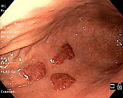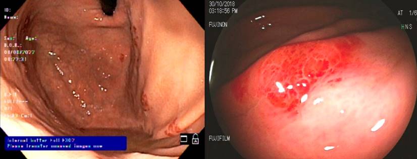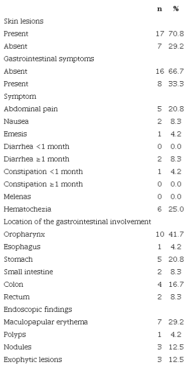 The primary location of the lesions was the upper gastrointestinal tract, especially the oropharynx. This information agrees with various cases in which commitment at this level was also more frequent6-9,11,12,22. In the present study, maculopapular erythema was the most repeated endoscopic finding; still, in the literature, the polypoid/nodular lesion is the most common8,13. This difference could be related to the sample size; the endoscopic assessment of lesions is subjective, and there may be variations in the semiological interpretation. Subsequent studies should contrast what is noted in this study.