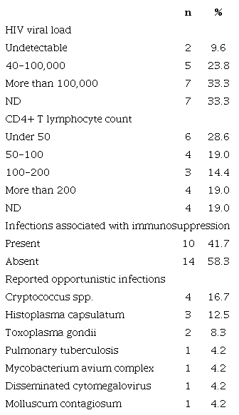 In the group with HIV infection, two of the 21 patients had undetectable viral loads (9.5%), and six had loads greater than 100,000 copies/mL (28.5%). Regarding the CD4+ T lymphocyte count, 28.6% had a count of less than 50 cells/μL at the time of KS diagnosis, 16.7% had between 50 and 100 cells/μL, and 19% had a count greater than 200 cells/μL.41.6% of the patients suffered from other opportunistic infections; the most frequent were those caused by Cryptococcus spp. (16.7%), Histoplasma capsulatum (12.5%) and Toxoplasma gondii (8.3%). On the contrary, there was no identification of opportunistic microorganisms in 58.3% of the patients (Table 2).