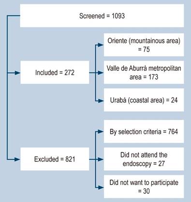 The sample size was calculated based on the number of patients treated in four months in the EGD services of the participating institutions (n = 4024 individuals). It was estimated using Epidat version 3.1 with a confidence interval (CI) of 95%, power of 80%, and accuracy of 5.8%. In total, 265 individuals were included, distributed as follows: 63.8% (n = 169) came from AMVA, 27.5% (n = 73) from Oriente, and 8.7% (n = 23) from Urabá.