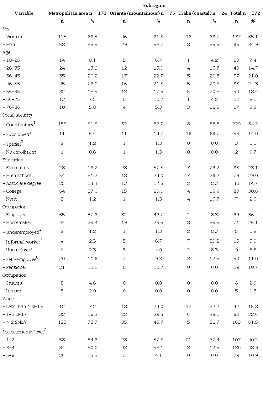 65.1% (177) were women. The average age was 48.9 ± 15.6 years, and 45.3% (123) participants were between 36 and 55 years old. 95.6% (260) of the study population were mestizos, and 3.4% (12) called themselves Afro-Colombian, indigenous, and gypsy/ROM. Patients residing in Urabá had unfavorable socioeconomic characteristics compared to the other subregions. In Urabá, we found a higher proportion of people in the subsidized system (66.7%), low level of schooling (complete elementary or lower) (45.8%), a higher proportion of unemployment (8.3%), informal employment (29.2%), monthly income greater than or equal to a minimum wage (52.2%), and low socioeconomic status (87.4%) (Table 1).