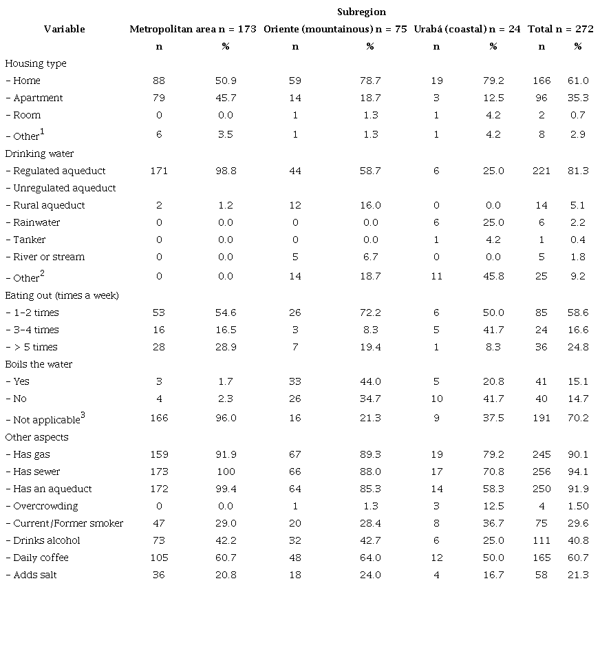 84.2% (229/272) of the population lived in urban areas. The AMVA has the highest percentage with 93.6% (162/173), and the Oriente subregion concentrated the most significant number of individuals from rural areas with 28/75 (37.3%). Concerning utilities, 100% of the participants had electricity at home. Regarding access to aqueducts, differences were observed: of the participants, 9.5% (26/272) used untreated water for consumption (Table 2). Of the population, 1.5% (4/272) lived in overcrowded conditions, and as to lifestyles, 10.3% of patients (28/272) had a smoking habit. Of the latter, 21.4% (6/28) were heavy smokers (> 15 cigarettes/day), according to the classification of the World Health Organization (WHO)23.