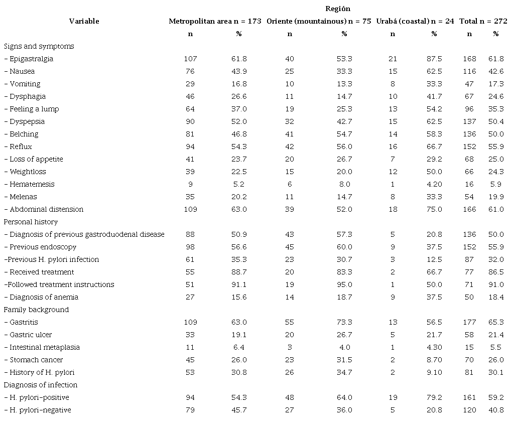 Aim: To determine the frequency of Helicobacter pylori and sociodemographic factors, life habits, and personal and family history of gastroduodenal diseases in patients who required and were taken to GI endoscopy (symptomatic or by screening) in seven endoscopy units in three Antioquia subregions.