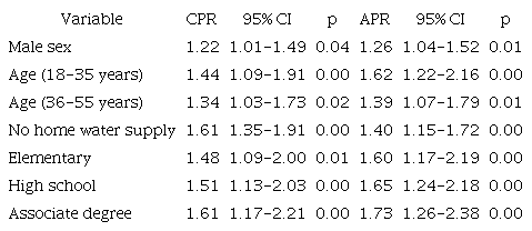 Results: The frequency of H. pylori infection was 55.9%, with differences by subregion (Valle de Aburrá metropolitan area: 54.3%, Oriente: 64%, and Urabá: 79.2%). Factors associated with H. pylori infection were male sex (adjusted prevalence ratio [APR] = 1.26; 95% confidence interval [CI] = 1.04-1.52), age 18-55 years (APR = 1.62; CI 95% = 1.22-2.16), absence of drinking water (APR = 1.40; 95% CI: 1.15-1.72) and educational level below university (APR = 1.73; 95% CI% = 1.26-2.38).