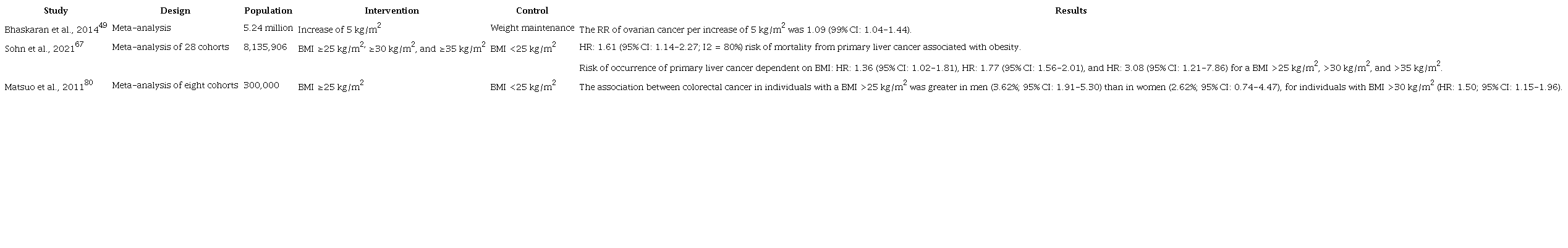 A literature search was conducted in the PubMed database using the following strategy: ((((((((((“Obesity”[Mesh])) OR (“Obesity/etiology”[Mesh] OR “Obesity/metabolism ”[Mesh] OR “Obesity/physiopathology”[Mesh] OR “Obesity/statistics and numerical data”[Mesh])) AND “Neoplasms”[Mesh]) OR (“Endometrial Neoplasms/classification”[Mesh] OR “Endometrial Neoplasms /etiology”[Mesh] OR “Endometrial Neoplasms/physiopathology”[Mesh] OR “Endometrial Neoplasms/statistics and numerical data”[Mesh])) OR (“Breast Neoplasms/classification”[Mesh] OR “Breast Neoplasms/etiology”[Mesh] OR “Breast Neoplasms/physiopathology”[Mesh] OR “Breast Neoplasms/statistics and numerical data”[Mesh])) OR (“Prostatic Neoplasms/etiology”[Mesh] OR “Prostatic Neoplasms/physiopathology”[Mesh] OR “ Prostatic Neoplasms/statistics and numerical data”[Mesh])) OR (“Colonic Neoplasms/etiology”[Mesh] OR “Colonic Neoplasms/physiopathology”[Mesh] OR “Colonic Neoplasms/etiology”[Mesh])) OR (“Liver Neoplasms/etiology”[Mesh] OR “Liver Neoplasms/physiopathology”[Mesh] OR “Liver Neoplasms/statistics and numerical data”[Mesh])) OR (“Ovarian Neoplasms/physiopathology”[Mesh] OR “Ovarian Neoplasms /statistics and numerical data”[Mesh])) OR (“Pancreatic Neoplasms/etiology”[Mesh] OR “Pancreatic Neoplasms/physiopathology”[Mesh] OR “Pancreatic Neoplasms/statistics and numerical data”[Mesh])) OR (“Bariatric Surgery/epidemiology”[Mesh] OR “Bariatric Surgery/etiology”[Mesh] AND “Bariatric Surgery/statistics and numerical data”[Mesh] OR “Bariatric Surgery/therapeutic use”[Mesh]).
