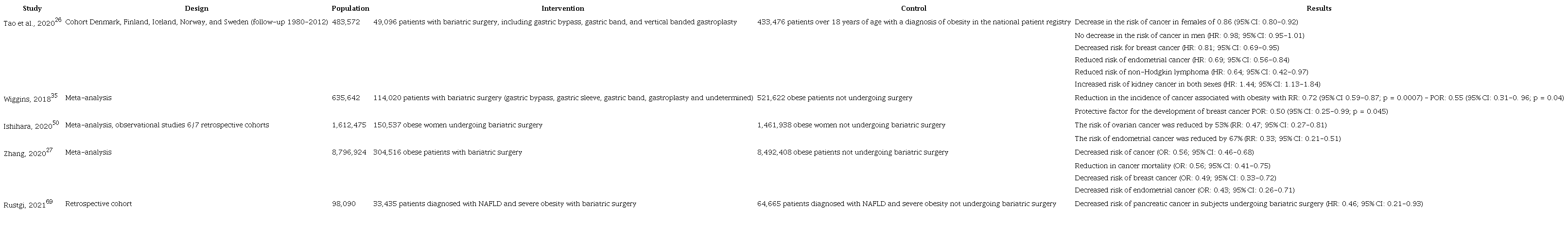 Tabla 2 summarizes the primary studies that have examined the benefit of bariatric surgery in protecting against different cancers.