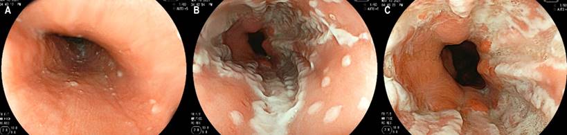 The distal esophagus is affected in more than 60% of cases, and the middle esophagus in up to 40%. Isolated middle and proximal third infections are much less frequent11. The final diagnosis is made through histopathological analysis of esophageal biopsies, in which ballooning degeneration of epithelial cells, multinucleated giant cells, Cowdry type A inclusions, and immunohistochemical staining for viruses are found10. Moreover, molecular biology studies are also helpful14,15. When conventional histopathological analysis is associated with polymerase chain reaction, a diagnostic yield of up to 90% can be achieved9. The serological diagnosis of primary infection is made with the positivization of antibodies or a four-fold increase in immunoglobulin G (IgG) between the acute disease stage and recovery 10.