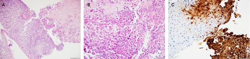 Dysphagia/odynophagia was studied with upper gastrointestinal endoscopy, which revealed severe ulcerated esophagitis, with a circumferential ulcer in the entire distal third and several triangular ulcers that ascended to the middle third, accompanied by cottony plaques in the proximal third that were hardly removed with washing (Figure 1). Given the findings, an infectious origin of the esophagitis was suspected, and biopsies were taken, showing an ulcerated mucosa with foci of necrosis, numerous neutrophils, cellular debris, lymphoplasmocytes, hemorrhage, and abundant multinucleated giant cells. Immunohistochemistry for herpes type I had strongly positive staining in the multinucleated giant cells (Figure 2).