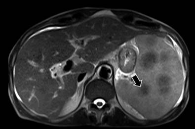 Abdominal computed axial tomography (CT) revealed splenomegaly with multiple nodular images in its parenchyma, focal alteration in the contour of the right hepatic lobe due to an isodense nodule, in addition to nodular involvement of the fat of the greater omentum and adenomegaly in the hepatic hilum and retroperitoneum, with ascitic fluid. Chest CT identified multiple nodular images in the lung parenchyma with granulomatous lesions in the middle lobe without other alterations. Similar findings were confirmed on contrast-enhanced abdominal magnetic resonance imaging (MRI), raising the possibility of neoplastic disease (Figure 1).