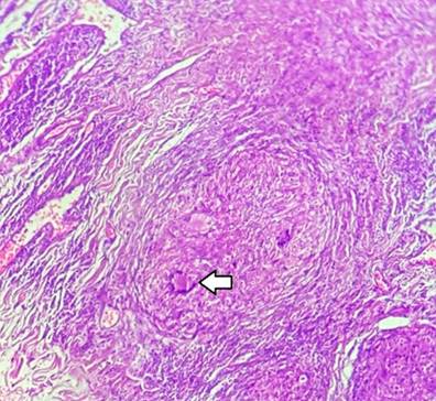 Histopathology of the peritoneum showed chronic non-necrotizing granulomatous inflammation consistent with peritoneal tuberculosis (Figure 2).