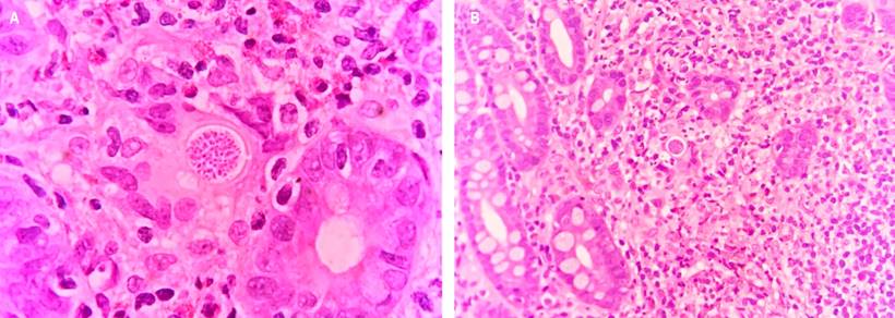 The anatomopathological study of the endoscopic biopsy of the lesion identified acute and chronic ulcerated duodenitis with a granulomatous component and abundant blastoconidia compatible with Coccidioides spp (Figure 2).
