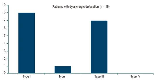 At a manometric level, we found 50% normal pressure, 46% hypotonia of the anal sphincter, and 4% hypertonia; the voluntary contraction test was normal in 76% and abnormal in 24%. A pattern of dyssynergic defecation was documented in 5% of patients, and the most frequent was type I, followed by type III (Figure 1).