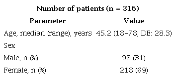 Three hundred sixteen patients were included, predominantly women (65%), with a median age of 45.2 years, a minimum age of 18, and a maximum age of 78 years (Table 1), all with symptoms of proctalgia fugax according to the Rome IV criteria.