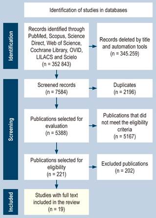 A comprehensive and systematic search strategy was devised to identify available and relevant studies. We used MeSH and DeCS terms in the different databases: PubMed, Scopus, Science Direct, OVID, Cochrane Library, Scielo, Web of Science, and Virtual Health Library. No language restrictions were applied.