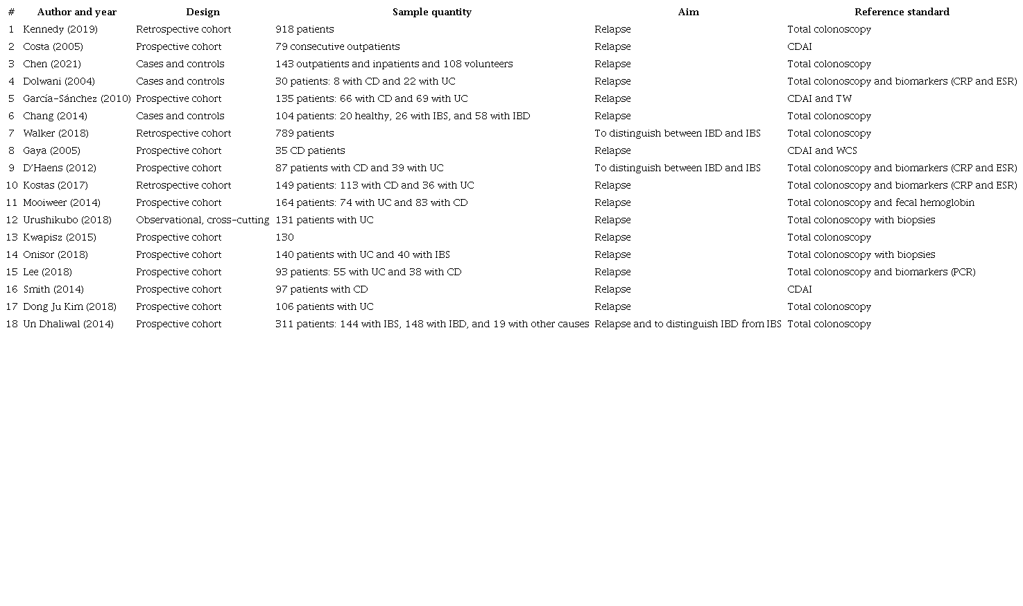 Of the total number of studies, 14 studied clinical activity to determine the risk of relapse, two analyzed FC to distinguish between IBD and an organic disorder such as irritable bowel syndrome (IBS), one evaluated both problems, and another used FC to assess progression in both UC and CD.