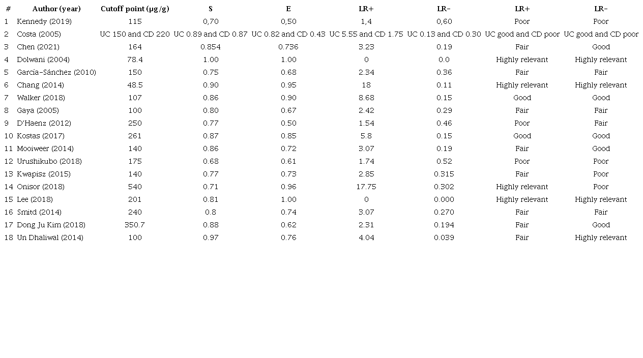 In all the selected articles, summarized in Table 2, the ROC curve was used to determine the best cutoff value of the FC; however, there is no consensus on the cutoff points, which range from 48.5 to 710 μg/g. These values significantly varied in sensitivity, from 70% to 100%, while the specificity values found were more heterogeneous: from 50% with a cutoff point of 15 μg/g to 100%. The positive (LR+) and negative (LR-) likelihood ratios were calculated for all the papers, concluding that, according to the LR+, in four articles, the FC allows confirming the disease with high certainty and managed to have a very low LR- that is highly relevant to rule out disease. Still, three articles referred to these values with poor relevance to confirm and rule out the pathology.