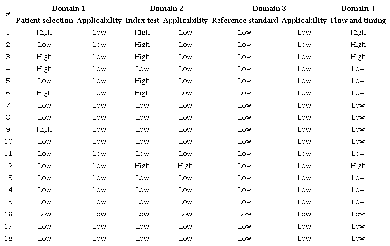 In a diagnostic test accuracy SLR by Hosseini et al. in 2022, QUADAS-2, an exclusive tool for diagnostic accuracy studies, was also used. Both in our research and in the review by Hosseini et al., this method was operated independently by the authors, with the difference that a third author, who evaluated the discrepancies between the two principal authors, was included in such SLR. It should be noted that they also classified the biases as low, moderate, and high risk. In contrast, only high and low risk were included in our review, according to the domains and their applicability12.