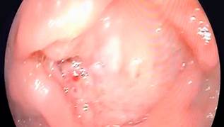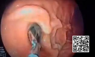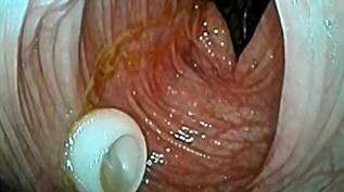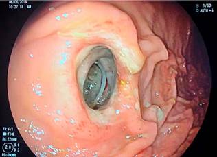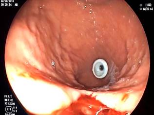 A 65-year-old male patient with sequelae of post-cardiac arrest hypoxic-ischemic encephalopathy required PEG due to a severe swallowing disorder. The attending group requested an evaluation (15 days after the gastrostomy) due to liquid stools with the same characteristics as the nutrition each time it was administered through a tube. He underwent an endoscopy, and the internal disc was not found. Given the clinical picture, displacement of the internal disc outside the stomach (gastrocolic fistula) was suspected (Figure 4). A total colonoscopy was performed, finding the internal retention disc of the gastrostomy at the transverse colon level. We decided to remove the tube and leave him under observation for seven days, after which total closure of the fistula was observed on endoscopic follow-up.