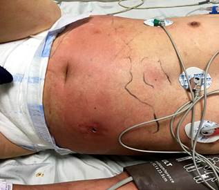 A 50-year-old male patient with sequelae of an ischemic stroke underwent PEG for a swallowing disorder. Seventy-two hours after the procedure, edema and erythema were found in the peristomal area, rapidly progressing to the rest of the abdominal wall, forming fasciitis (Figure 6). A soft tissue ultrasound was performed without finding wall collections but fascia inflammation. With the diagnosis of surgical site infection, the tube was removed, and parenteral antibiotic therapy was started. The nasogastric nutrition tube was advanced to ensure enteral nutrition. Once the infection resolved, a new gastrostomy was performed without complications.