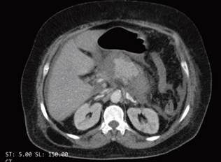 Arterial thromboses are the rarest vascular complication of pancreatitis; a prospective study that sought to evaluate arterial complications in 189 patients with acute pancreatitis did not find arterial thrombosis10, and reports of these complications have been limited to case series. During the review of the literature, case reports of thrombosis of the superior mesenteric artery11,12, renal arteries13, aortic thrombosis14, and the celiac trunk15 were found. No reports of hepatic artery were identified. Moreover, no other apparent causes of mesenteric arterial thrombosis were detected in our patient.