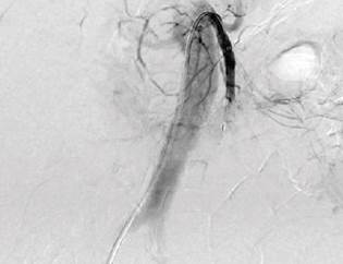 The patient was immediately taken for an abdominal aortography, selective arteriography of the abdominal vessels, and thromboembolectomy by interventional radiology, finding occlusion of the common hepatic, superior mesenteric, and inferior mesenteric arteries (Figure 2). Using 6 Fr and 8 Fr indigo catheters, aspiration thrombectomy was performed on multiple occasions, and acute and subacute clots were obtained, with which it was only possible to revascularize the proximal third of this artery with outflow through the pancreatoduodenal arch that reperfused the hepatic artery proper and the first jejunal branch (Figure 3). The distal two-thirds of the superior mesenteric artery could not be revascularized due to poor outflow. Immediately after the procedure, the patient was taken to ERCP. In the second duodenal portion, marked edema that did not allow visualization of the papilla was observed, so the procedure was suspended.