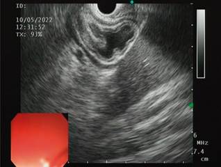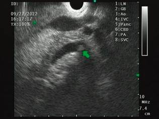 We present the case of a 32-year-old female patient with a history of gastric bypass surgery for morbid obesity. After the associated weight loss, the patient had an episode of abdominal pain with an ultrasound diagnosis of cholelithiasis, which required a laparoscopic cholecystectomy one year before the current consultation. On admission, the patient reported abdominal pain in the upper quadrants, predominantly on the right, associated with mild jaundice and choluria without acholia. With suspected residual choledocholithiasis, the patient was taken for magnetic resonance cholangiography, which failed to identify the causes of pain associated with jaundice. A biliopancreatic endoscopic ultrasound (EUS) was requested, which showed a bile duct of standard diameter with an oval echogenic image of 3.8 mm in diameter, floating and with acoustic shadowing upon the alpha maneuver from the first scanning station (the other stations were not evaluable due to the history of bypass; Figure 1). This finding is compatible with choledocholithiasis, for which ERCP is indicated.