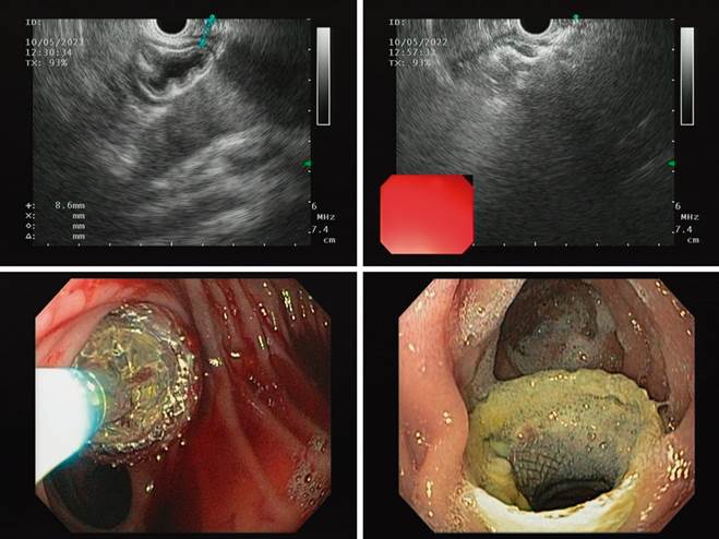 At the time, the patient had no symptoms, so we decided to perform the procedure in two stages: in the first stage, an EUS-guided jejunogastrostomy with apposing stenting, which allowed the complete expansion of the stent and maturation of the tract. In the second stage, one week after stenting, consisting of the usual ERCP, the side-viewing duodenoscope was advanced.