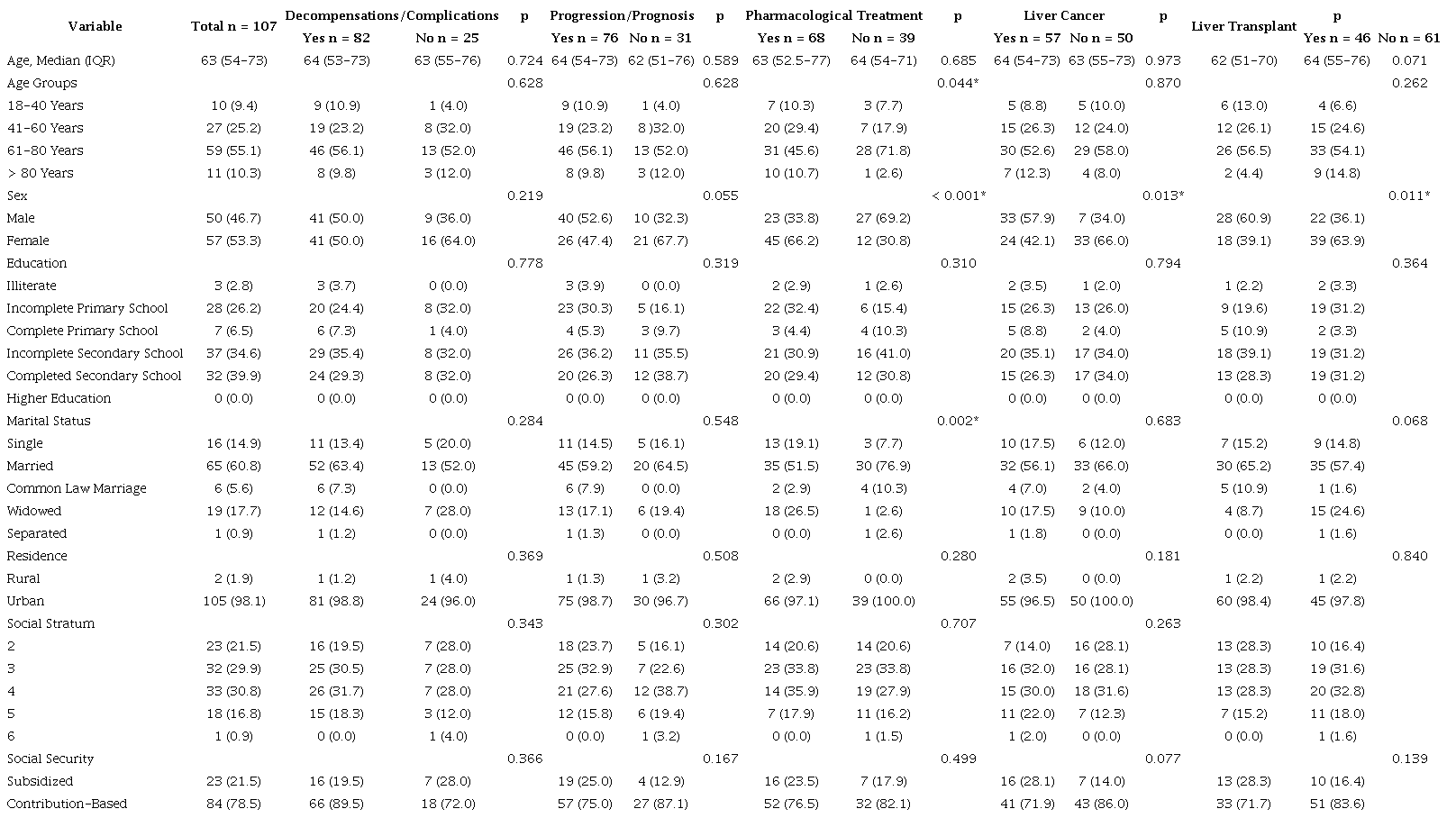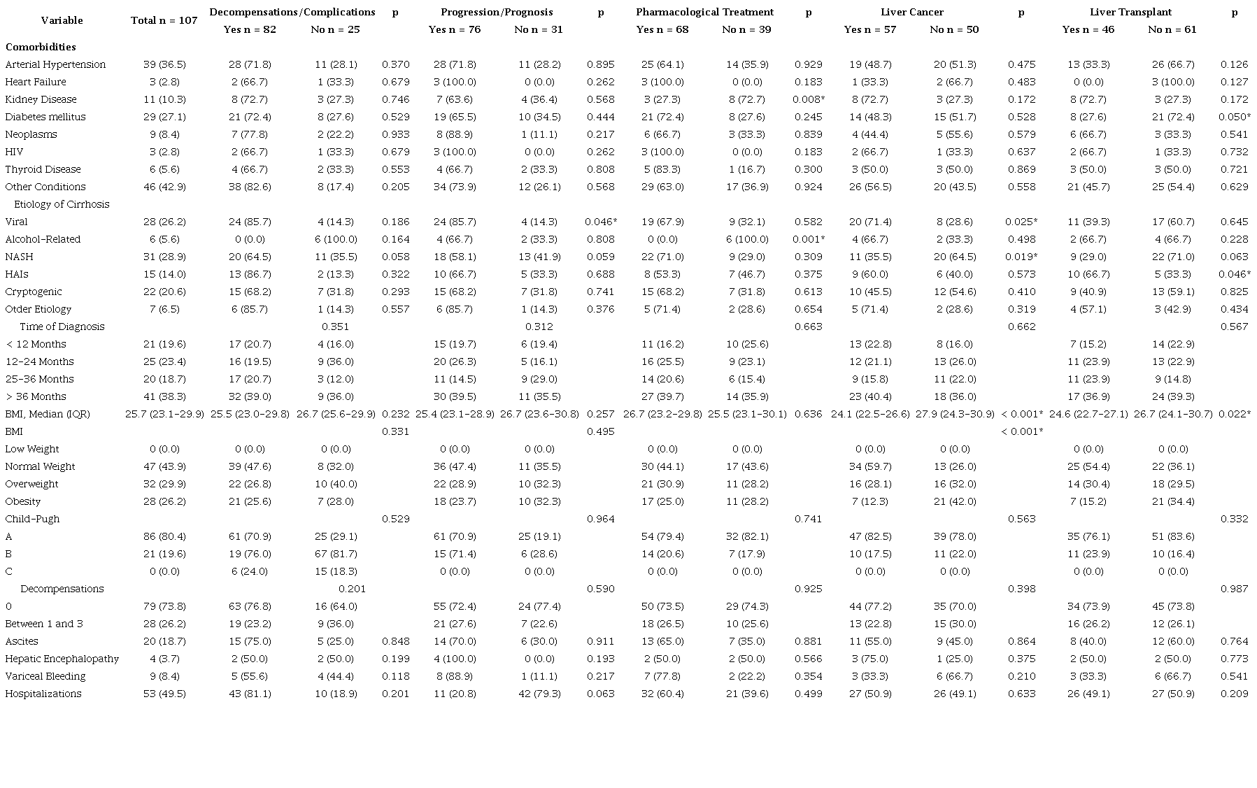 The comorbidity most commonly reported was overweight/obesity/dyslipidemia, followed by arterial hypertension (HTA) at 36.5% (n=39), and diabetes mellitus (DM) at 27.1% (n=29). Non-alcoholic steatohepatitis (NASH) emerged as the most frequent etiology of cirrhosis at 28.9% (n=31), with viral etiology following at 26.2% (n=28). A significant portion of patients, 38.3% (n=41), reported being diagnosed more than 36 months ago. Overweight or obesity was noted in 56.1% (n=60) of patients. A majority, 80.4% (n=86), were in a compensated phase (Child-Pugh A), and 19.6% (n=21) were in stage B. Detailed characteristics of the clinical and sociodemographic profile of the sample are provided in Tables 1 and 2.