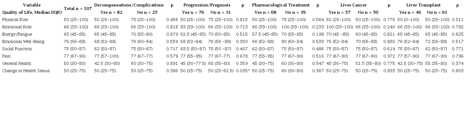The analysis of quantitative variables was conducted using measures of central tendency appropriate to the variables’ distribution, employing the Shapiro-Wilk test for determination. Qualitative variables were described using absolute and relative frequencies. The chi-square test was utilized to identify sociodemographic, clinical, and historical factors associated with information needs. The relationship between information needs and quality of life in cirrhotic patients, as measured by the SF36V2 scale, was explored by comparing the mean SF36V2 scores between patients who identified this specific need as among their top five and those who did not. To examine the interplay between the utilization of support services, the perceived need for these services, and quality of life, SF36V2 scores were compared based on reported service use and perceived access need. The Mann-Whitney U test was employed for SF36V2 score comparisons. A p-value of less than 0.05 was considered indicative of statistical significance. The statistical analysis was conducted using Stata software version 16.0.
