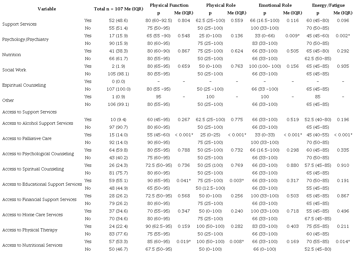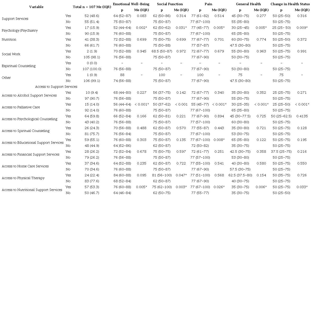 An analysis of the association between perceived need for certain support services revealed a correlation between the lack of perceived need for palliative care access and higher scores across physical function, physical role, emotional role, energy/fatigue, emotional well-being, social function, pain, general health, and changes in health status (p < 0.001 for all variables). Conversely, patients who deemed access to educational services a priority scored higher in physical function and physical role (p = 0.041 and p = 0.003, respectively) compared to those who did not prioritize it.
