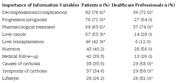Conclusions: The information needs of patients with cirrhosis of the liver may vary depending on the etiology, the existence of comorbidities, and other sociodemographic variables such as sex and age. There are gaps between the information needs perceived by health personnel and the needs reported by patients.