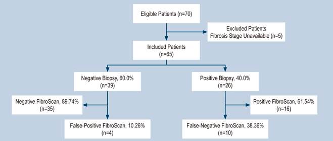 Of the 70 patients initially considered eligible, five were excluded due to the absence of fibrosis state reporting in their biopsy results, leading to a final cohort of 65 patients for analysis. Among these, 26 patients (40%) showed a biopsy positive for any degree of fibrosis. For the FibroScan evaluation, a threshold of 7 kPa was established, with readings greater than or equal to this value considered positive, and those below it deemed negative. Of the patients with biopsy-confirmed fibrosis, 16 (61.54%) had positive FibroScan results, while 10 (38.36%) were negative.
