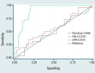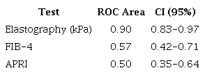 Resultados: La biopsia fue positiva para fibrosis en el 40%, FibroScan mostró un AUROC de 0,90 (intervalo de confianza [IC]: 0,83-0,97), índices APRI de 0,52 (IC: 0,35-0,68) y FIB-4 de 0,52 (IC: 0,37-0,68).