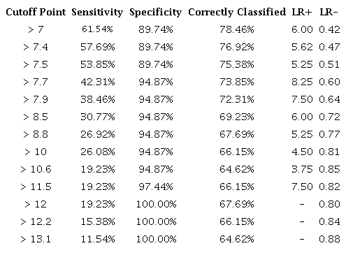 Table 4 collates the areas under the curve of the AUROC tests for the tested parameters along with their respective confidence intervals. Elastography emerges as the most effective measure.