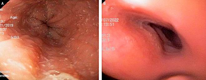 This case involves an 8-year-old male patient with a background of asthma, allergic rhinitis, and IgE-mediated food allergy. At 8 years, due to failure to thrive and extensive dietary restrictions, a UGIE and biopsy identified more than 20 eosinophils per HPF, alongside exudates, rings, and furrows (EREFS 4) (Figure 1A). Elevated specific IgE levels were documented for casein, serum albumins, egg (both yolk and white), fish, sesame, avocado, orange, strawberry, soy, and wheat. Subsequently, a diet restricting milk, egg, and fish was initiated, along with swallowed fluticasone at a dosage of 250 μg every 12 hours and PPI at a dose of 2 mg/kg/day, albeit without clinical improvement. Subsequent UGIE revealed an eosinophil count exceeding 50 per field.