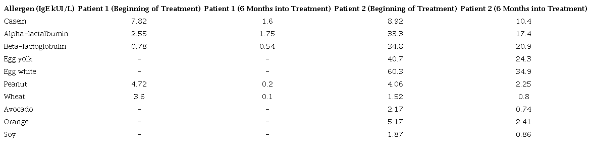 Spekhorst and colleagues (2022) described a cohort of 125 individuals with atopic dermatitis and food allergies who exhibited decreased specific IgE levels to foods after receiving dupilumab for atopic dermatitis14. Similarly, Rial and colleagues observed that patients with atopic dermatitis and IgE-mediated allergies to corn and nuts did not report symptoms following accidental ingestion after being treated with dupilumab15. In our patients, a decrease of over 50% in specific IgE levels to a majority of the restricted foods was recorded, enabling the cautious reintroduction of these foods with suitable clinical tolerance. These observations suggest that dupilumab may facilitate tolerance induction and mitigate the severity of allergic reactions to food by persistently inhibiting Th2 activity. Notably, in patient 2, an increase in casein levels was observed, hinting at the potential of dupilumab to uncover true food allergies.