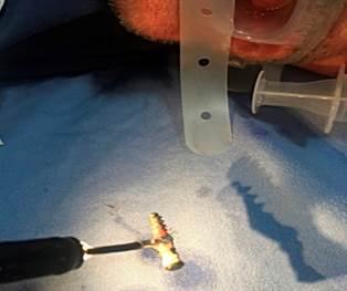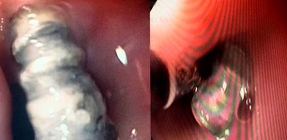 An esophagogastroduodenoscopy was conducted, revealing a piece of osteosynthesis material (screw) lodged in the upper third of the esophagus at the cricopharyngeal level. This foreign object was successfully removed using a foreign body forceps (Figures 2 and 3). The patient’s clinical progression was favorable, marked by the resolution of dysphagia, and no additional procedures or interventions were required.