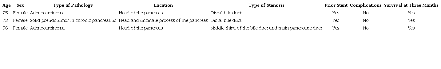 In the cases we presented (Table 1), each patient was female with an average age of 68 years. The pathologies involved tumors in the head of the pancreas, with associated bile duct involvement. One patient had chronic pancreatitis with a tumor that simulated an adenocarcinoma. In every case, stents were employed preemptively until cannulation of the ampulla of Vater could be accomplished. Notably, no complications occurred, and survival and follow-up were consistent across all cases for up to three months. Remarkably, the patient with chronic pancreatitis has not experienced any complications to date, suggesting good long-term stent maintenance-a promising indicator for future studies on stent durability.