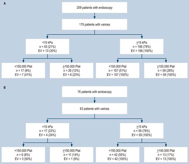 Materiales y métodos: Estudio transversal que incluyó a pacientes con cACLD, endoscopia digestiva alta y elastografía hepática transitoria desde enero de 2017 hasta diciembre de 2019.