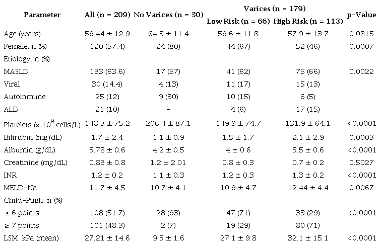 The high percentage of esophageal varices (85.6%) in our study may be attributed to the predominance of MASLD (63.6%) as the most prevalent etiology, aligning with demographic changes observed in our region26. Patients with MASLD are more likely to develop clinically significant portal hypertension, even in the early stages of hepatic fibrosis, compared to other etiologies27,28.