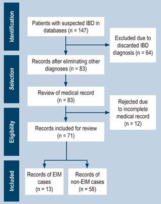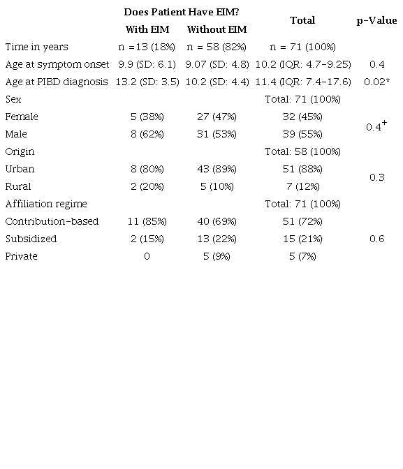 Methodology: Retrospective study of patients diagnosed with pediatric-onset IBD between 2007 and 2022 treated at an institution in Bogotá. A descriptive analysis was performed and in the groups with and without EIM clinical and biochemical variables were compared using Fisher’s exact test, Student’s T, and Mann-Whitney’s U.
