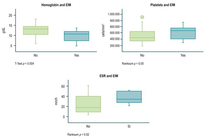 Descriptive statistics determined the frequency and percentages of categorical variables. For continuous variables, central tendency measures were determined according to their distribution (mean with standard deviation [SD], median with interquartile range [IQR]). The association between EIMs and demographic, clinical, and biochemical characteristics was evaluated using Fisher’s F for qualitative variables; for quantitative variables, the Mann-Whitney U test and Student’s T test were used according to the nature of the data distribution. A p-value < 0.05 was considered statistically significant.